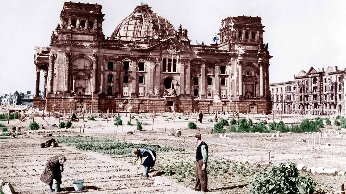 Menschen gärtnern vor dem zerbombten Reichstag.