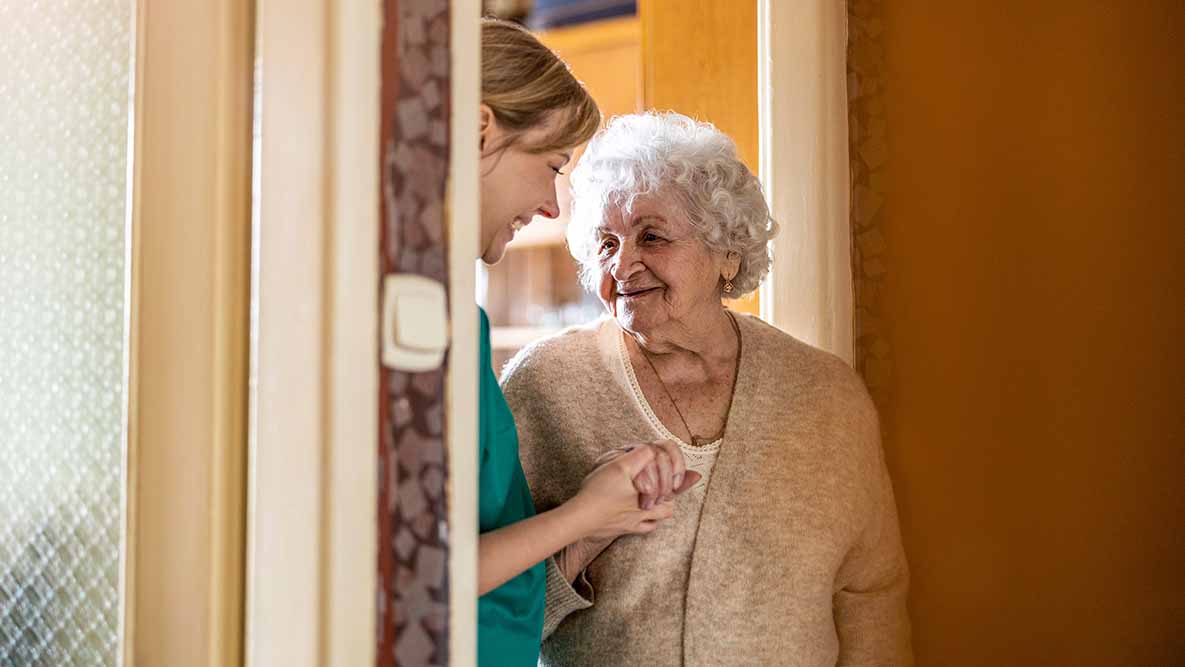Eine ältere Frau steht mit einer Pflegerin in einem Gang.