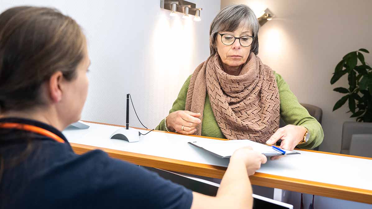 Eine Frau steht am Tresen einer Arztpraxis und erhält Unterlagen.