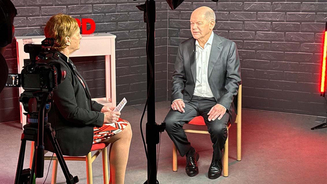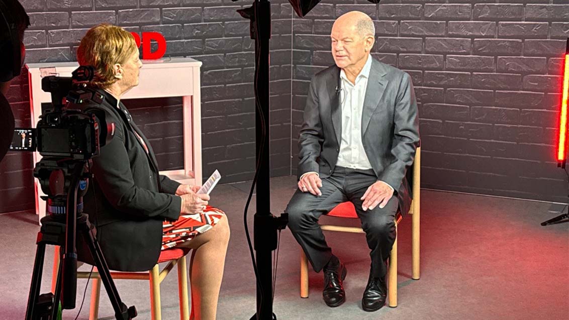 Bundeskanzler Olaf Scholz (SPD) sprach mit der SoVD-Vorstandsvorsitzenden Michaela Engelmeier vor der SoVD-Kamera über die Herausforderungen beim Wohnungsbau, in der Pflege und die Sicherung des Rentenniveaus.