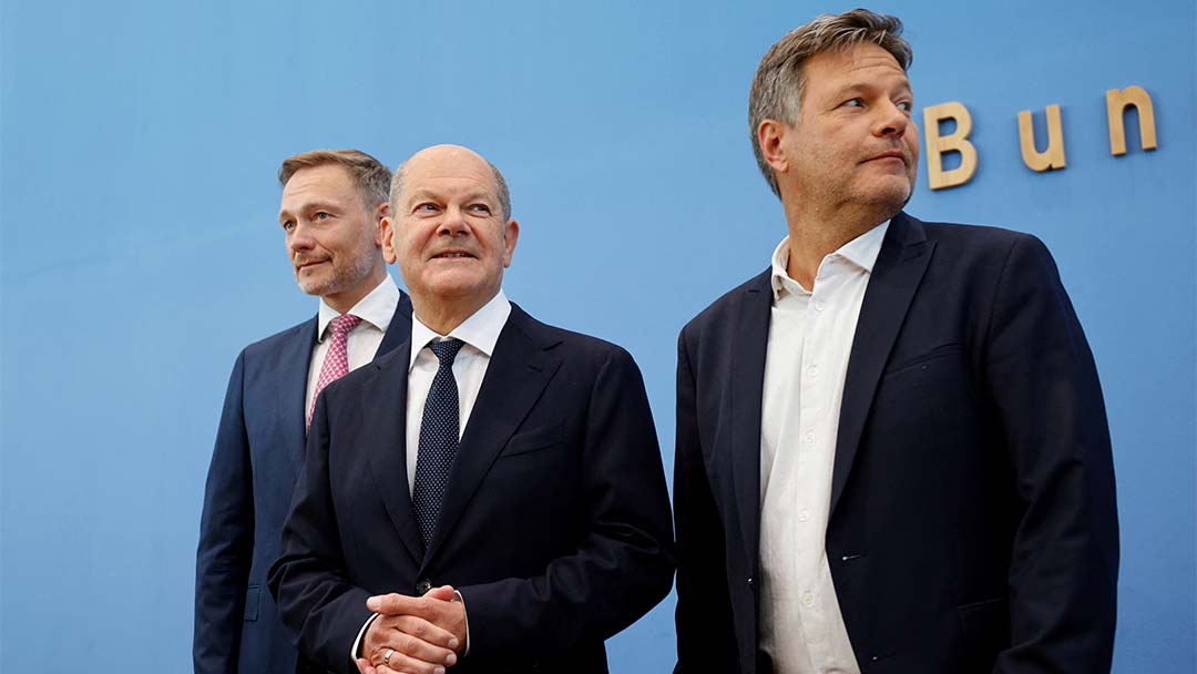 Christian Linder, Olaf Scholz und Robert Habeck stehen nebeneinander vor einem blauen Hintergrund.