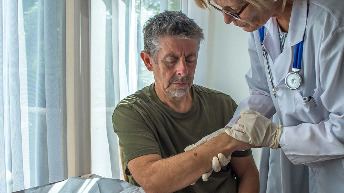Ärztin hält den Arm eines Patienten und betrachtet diesen.