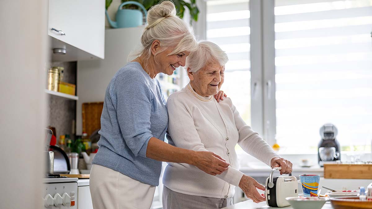 Eine ältere ist mit ihrer Mutter in der Küche und hält sie fest.