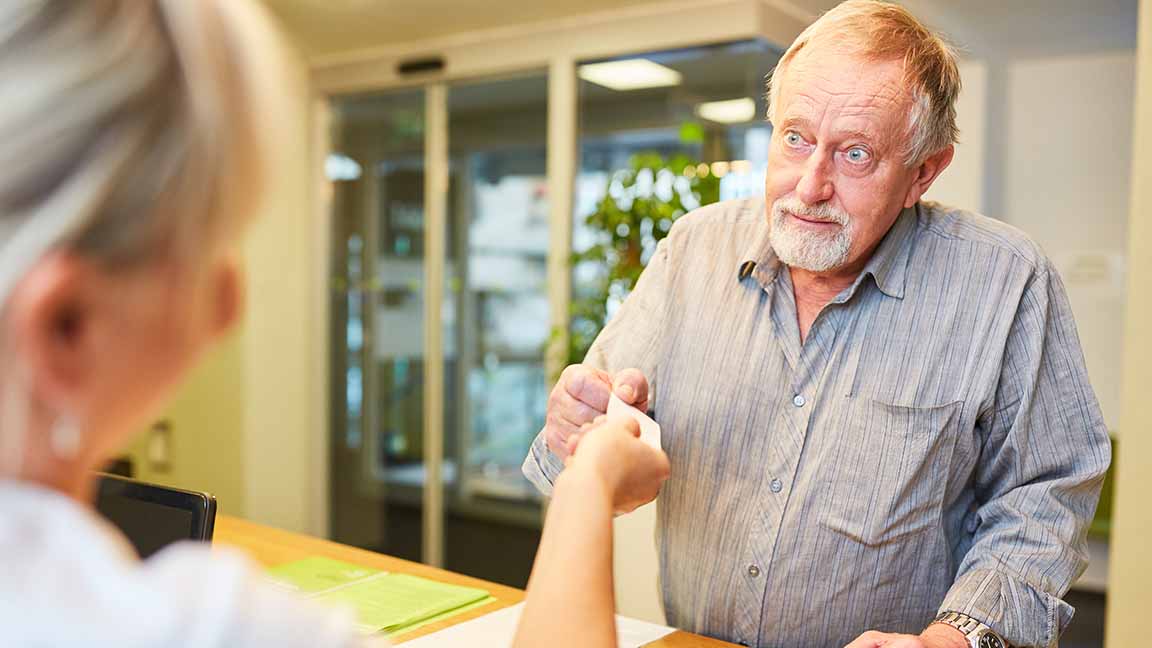 Mann gibt seine Versichertenkarte am Empfang einer Arztpraxis ab.