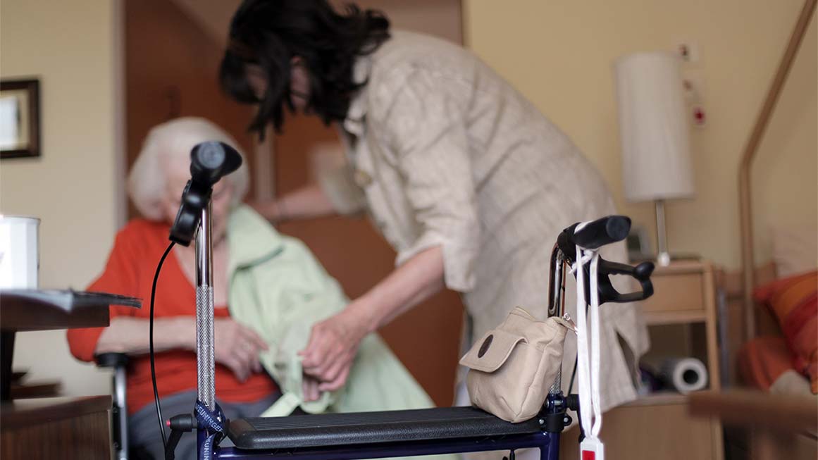 Eine ältere Frau wird von einer jungen Frau im Pflegeheim besucht. Im Vordergrund steht ein Rollator.