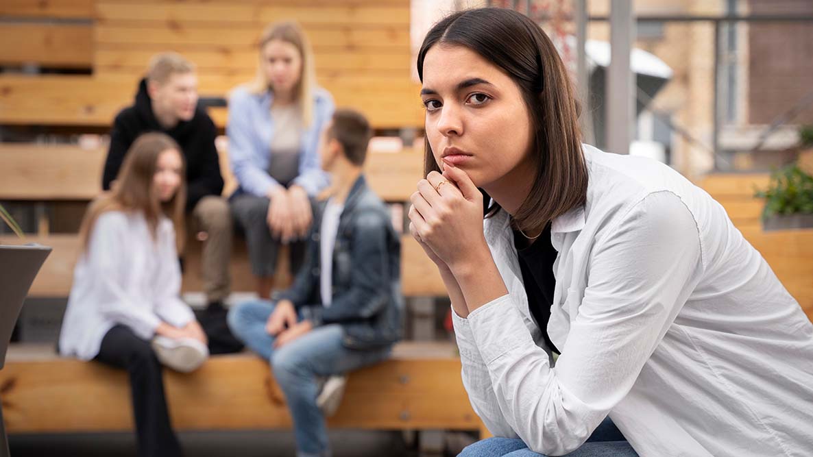 Eine junge Frau blickt besorgt in die Kamera, im Hintergrund reden weitere junge Menschen miteinander.