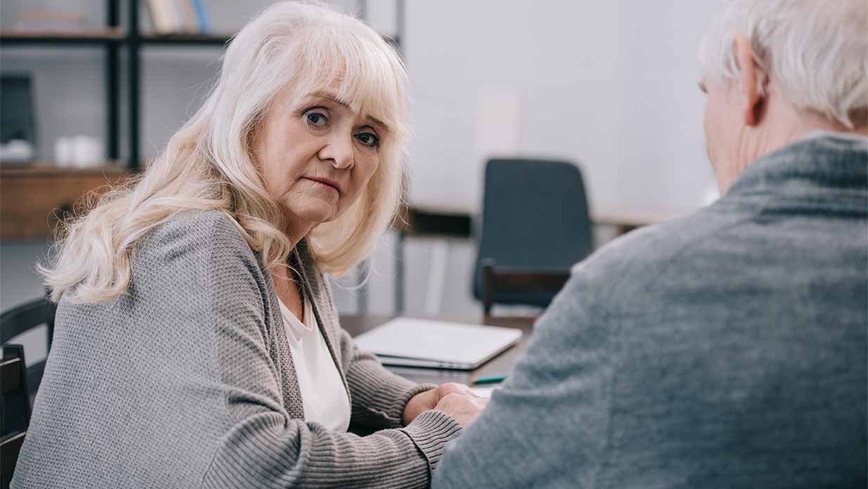 Eine ältere Frau sitzt mit ihrem Mann am Tisch und blickt besorgt in die Kamera.