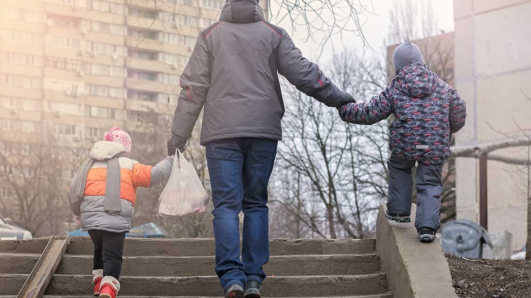 Erwachsener mit zwei Kindern in einer Plattenbausiedlung.
