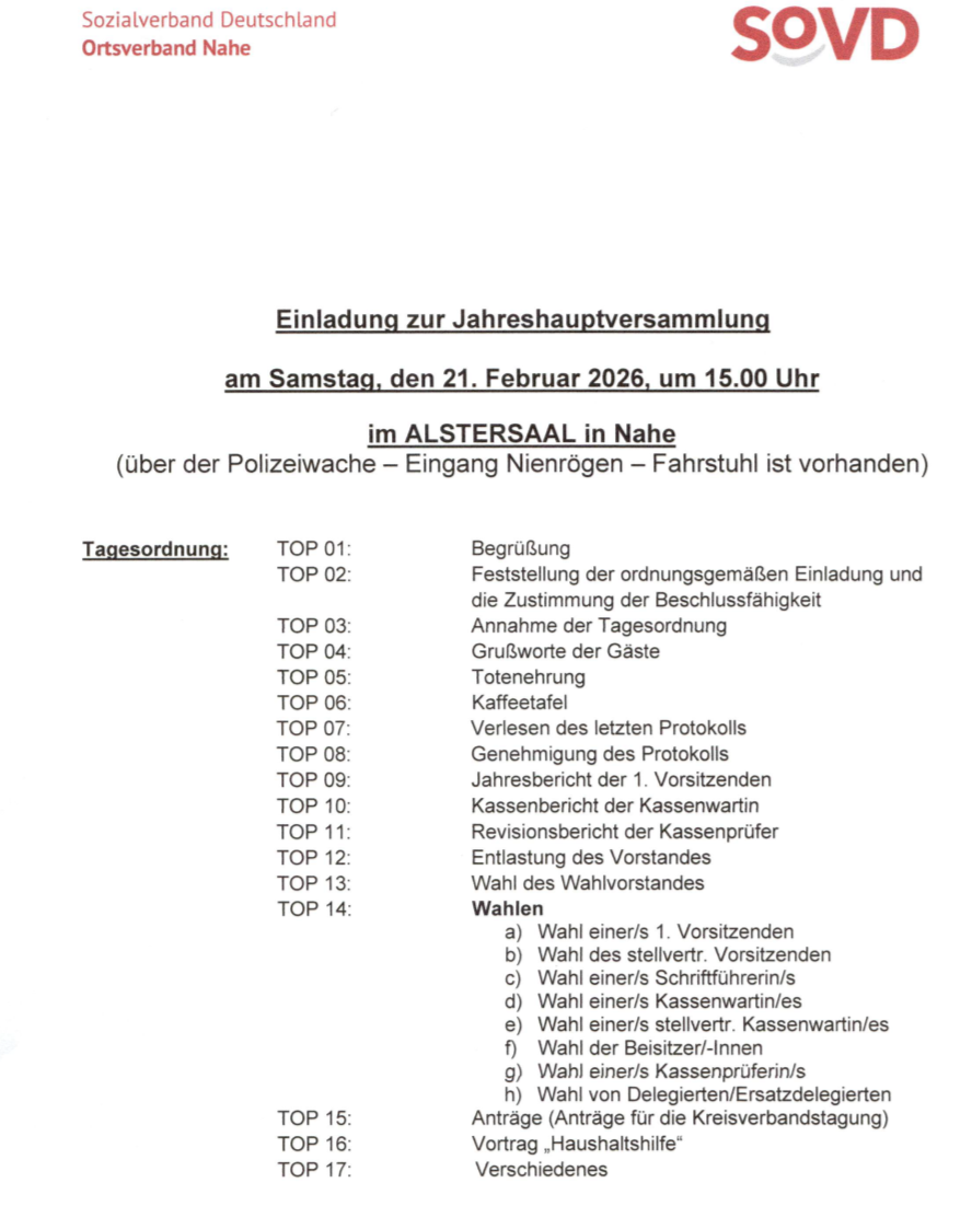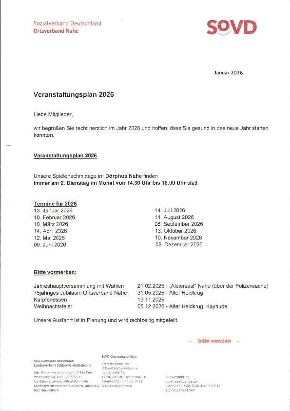 Als Anlauf- und Kontaktstelle für Mitglieder und für Interessierte bieten wir in ehrenamtlicher Regie regelmäßige Zusammenkünfte, Informationsveranstaltungen mit sozialpolitischem Inhalt, allgemeine Vorträge, gemütliche Runden und Feiern, Tages- und Mehrtagesfahrten und noch einiges mehr an. Das Motto unseres Ortsverbandes in Nahe lautet „gemeinsam statt einsam“.